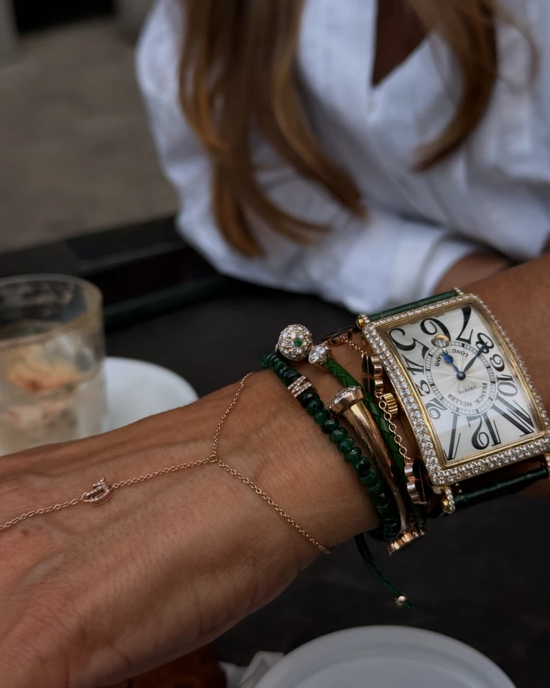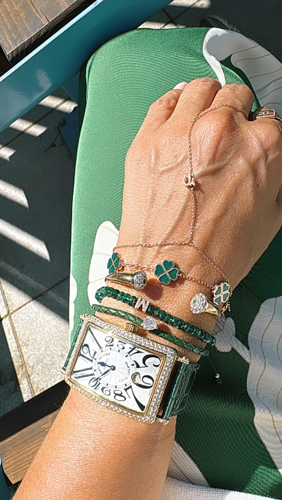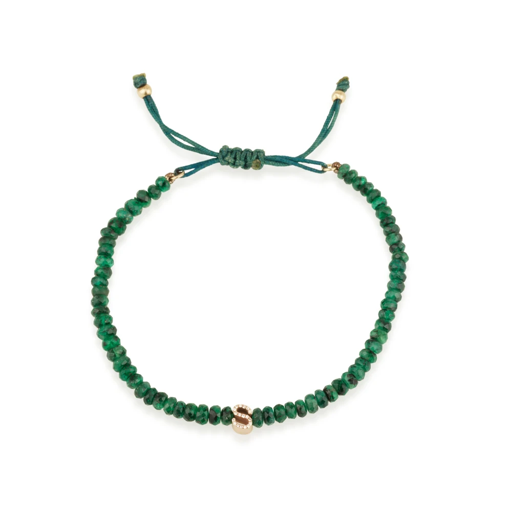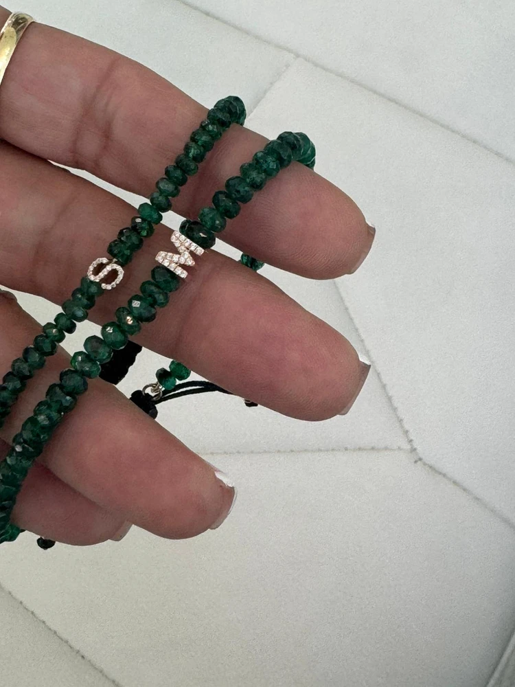 צמיד חרוזי אמרלד טבעי עם אות משובצת וסגירת מקרמה